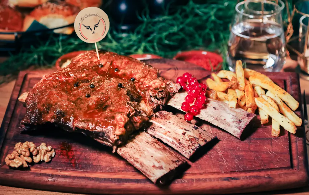 ASSADO Table-Cut for 2 people: 85€, 4 people 165€. Beef ribs confit, marinated, and roasted for 5 hours.