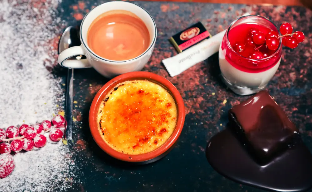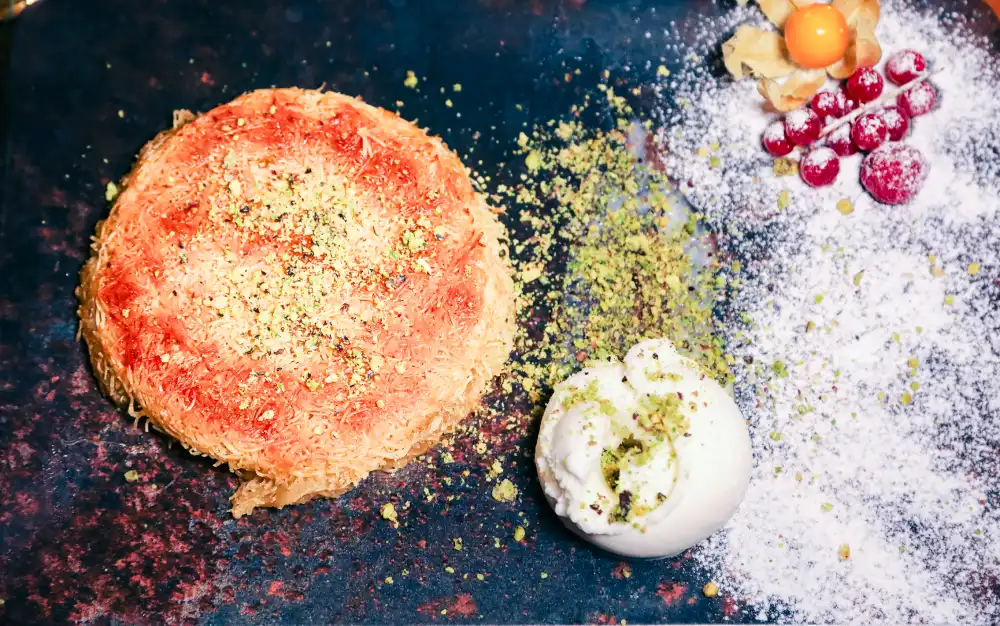 Künefe: Angel hair, pistachio powder, mozzarella, and ice cream (20 min). Baklava: Carrot slice with pistachio and ice cream. Fondant au Chocolat: Chocolate fondant with pistachio-sprinkled ice cream. Panna Cotta: Served with red fruit, chocolate, or mango coulis. Ice Cream: 2 or 3 scoops (vanilla, chocolate, strawberry). Café / Thé Gourmand: Accompanied by 4 petits fours. Riz au Lait: Rice pudding. Crème Brûlée: Classic crème brûlée. Assiette de Fruits: Fruit plate. Dessert du Jour: Dessert of the day.