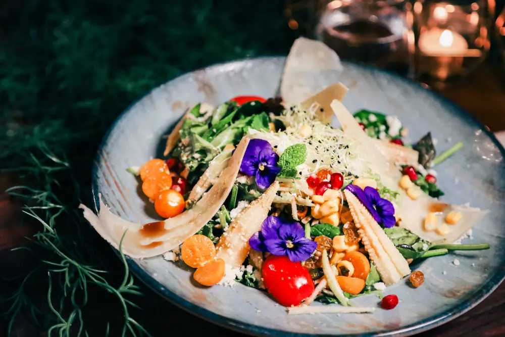 Salade du Colombier: A gourmet salad featuring green lettuce, pomegranate extract and seeds, sun-dried tomatoes, walnuts, raisins, olive oil, Tulum cheese, green apples, figs, dried apricots, pumpkin seeds, and sunflower seeds.
