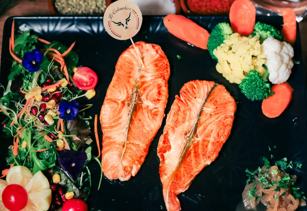 Avocado Salmon Salad: Mesclun lettuce, arugula, avocado sauce, fresh salmon, avocado, olive oil, corn, Parmesan cheese, red onions, and cherry tomatoes.