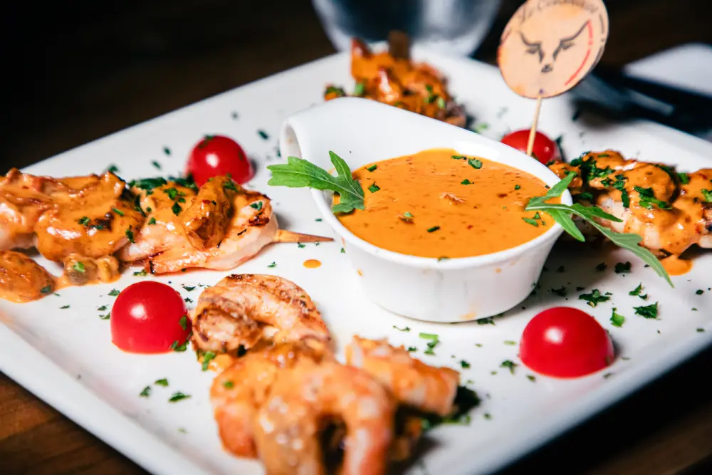 Marinated shrimp skewers with alcohol in the sauce.
