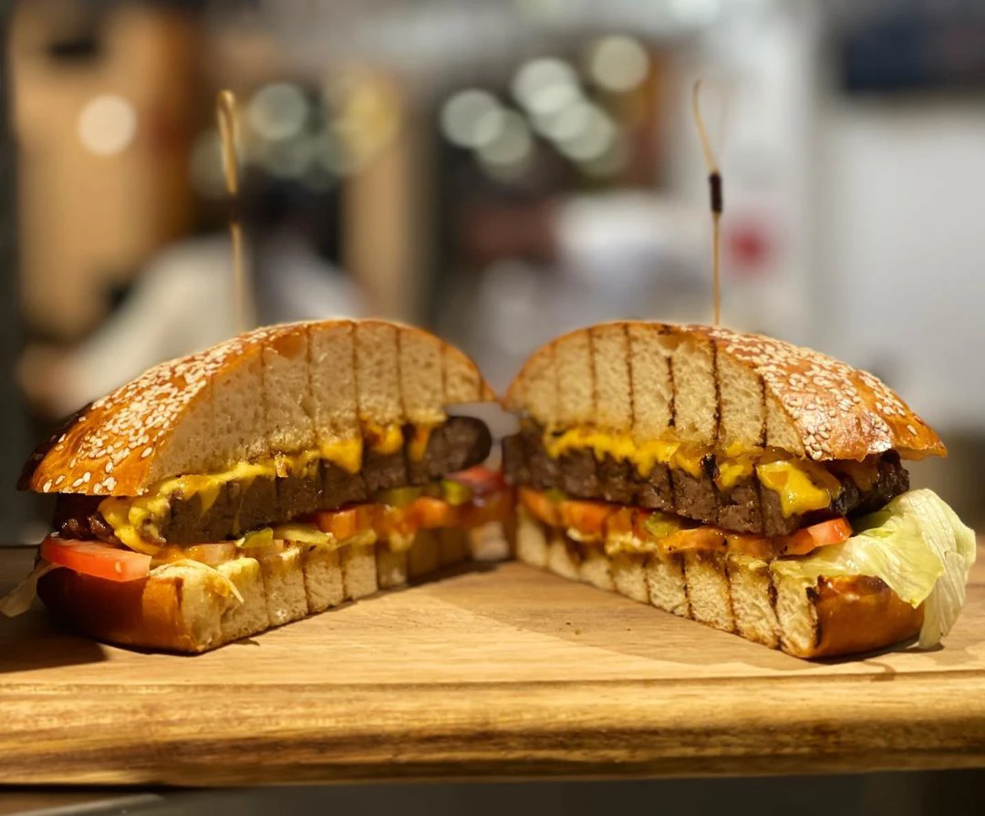 Hamburger avec Frites: Hamburger with fries, served with salad, tomato, pickles, burger sauce, cheddar, caramelized onions, and smoked beef.